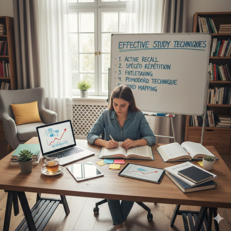 Effective study techniques help you focus better, understand topics deeply, and recall information quickly during exams. Instead of rereading notes again and again, you learn how to study in a smart and organized way. This saves time and increases confidence.